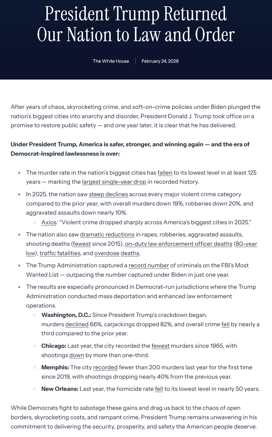 >>529302071https://www.whitehouse.gov/articles/2026/02/president-trump-returned-our-nation-to-law-and-order/