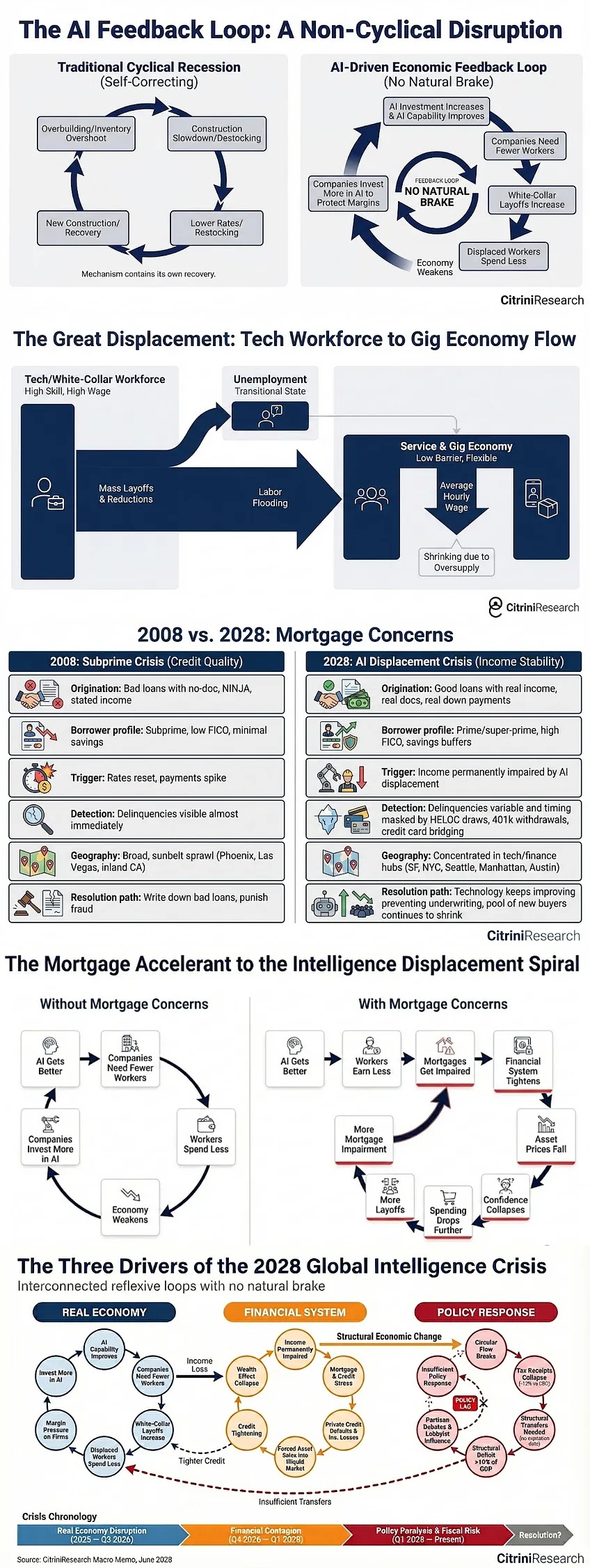 >>529305982This one will be, i guess. I largely agree with recent Citrini report predicting hyper-crisis for 2028.https://www.citriniresearch.com/p/2028gicIt warns of a potential unmatched global crisis from AIs rapid advancement: an "intelligence displacement spiral" where abundant AI substitutes human intelligence (once the scarcest economic input), causing mass white-collar job losses, deflation, and systemic collapse.it is first research so far predicting the global economy falldown/reset not because of the AI market bubble but because of ongoing AI implementation.Core mechanism:AI agents eliminate labor needs -> corporate margins rise briefly -> layoffs surge (esp. software, finance, services; 70% of advanced GDP) -> consumer spending collapses (displaced workers cut out of income loop) -> "Ghost GDP" (output grows on paper but doesnt circulate) -> demand falls -> more AI cost-cutting -> vicious negative feedback loop with no natural brake -> recession, financial defaults (private credit, mortgages), equity crash.By mid-2028, unemployment hits 10.2%, white-collar jobs vanish en masse, S&P 500 drops 38% from 2026 highs (potentially circa 3,500), private credit cascades, prime mortgages crack, global ripples like Indias IT exports collapse, policy fails, social unrest erupts - worse than GFC in structural terms due to intelligence repricing.