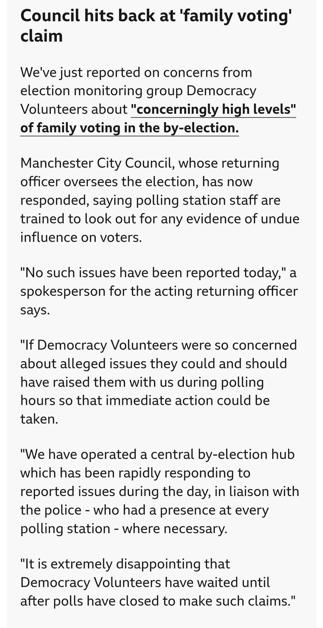 > NEW: International election observers recorded 32 cases of illegal family voting in the same polling booth across 15 polling stations in Gorton and Denton>"[These are] the highest levels of family voting at any election in our 10 year history of observing elections in the UK"Uh oh>John Ault, director of Democracy Volunteers, said: "Today we have seen concerningly high levels of family voting in Gorton and Denton. Based on our assessment of today’s observations, we have seen the highest levels of family voting at any election in our 10 year history of observing elections in the UK.>"We rarely issue a report on the night of an election, but the data we have collected today on family voting, when compared to other recent by-elections, is extremely high.>"In the other recent Westminster parliamentary by-election in Runcorn and Helsby we saw family voting in 12% of polling stations, affecting 1% of voters. In Gorton and Denton, we observed family voting in 68% of polling stations, affecting 12% of those voters observed"