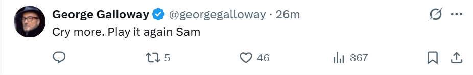 Lol can't help but love George Galloway, just handwaving 'cry more' about democratic integrity