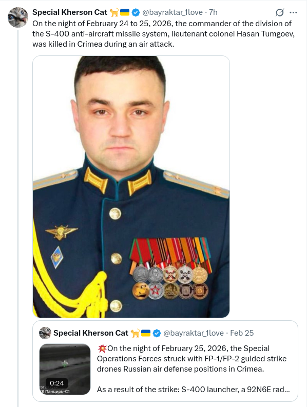 >>529313397>daily russophobia momentKilledInUkraine 27-02-2026 ieutenant Colonel Tyмгoeв Хacaн (Tumgoev Hasan), commander of the S-400 system division, eliminated near Sofiivka, Crimea