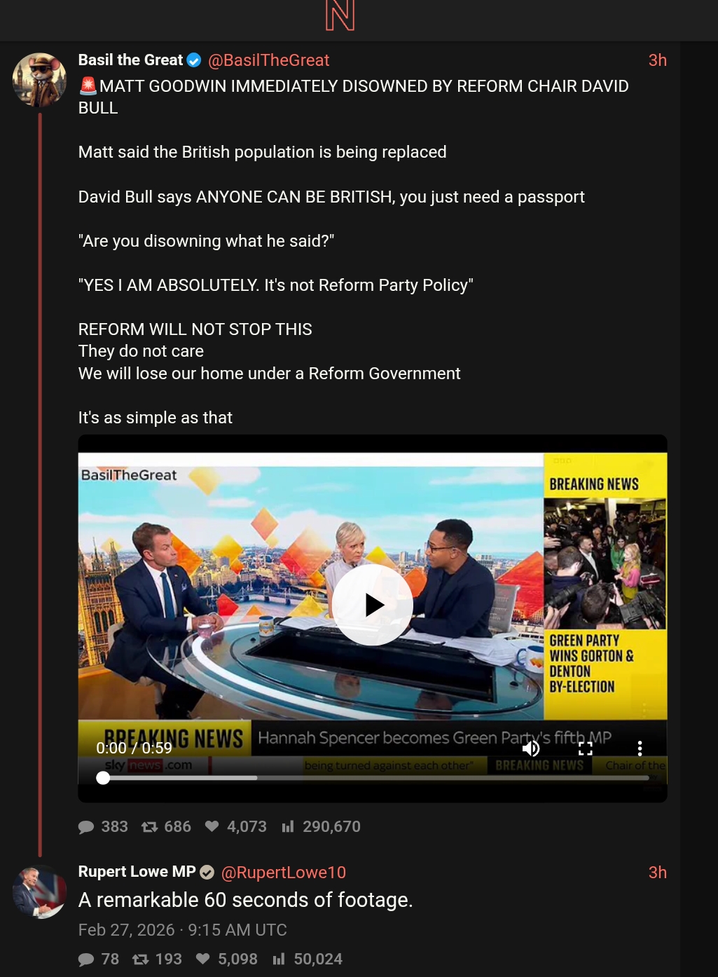 >>529314153If you are in a city, vote Greens.If you are not in a city, vote Restore Britain.This ensures mutual destruction of the Conservative and Labour parties. They do not deserve to govern ever again.