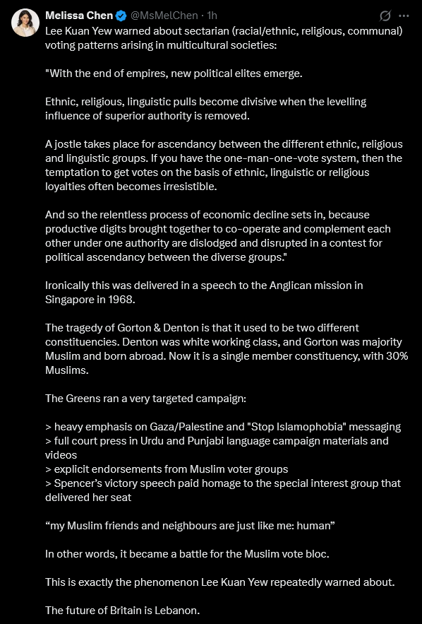 >>529314452I don't think so. Gorton & Denton is a seat which is approx 30% Muslim, the Greens pushed heavily on targeting Muslim voters, and there's a growing push to look into the impact of 'family voting' (a result of South Asian clannish norms) on the outcome. Today's result was very obviously a consequence of demographics above anything else. This is a continuation of the sudden shock appearance of the so-called 'Gaza Independents' at the last GE, the Greens just happen to be the only established party than can really accommodate those types (for now)