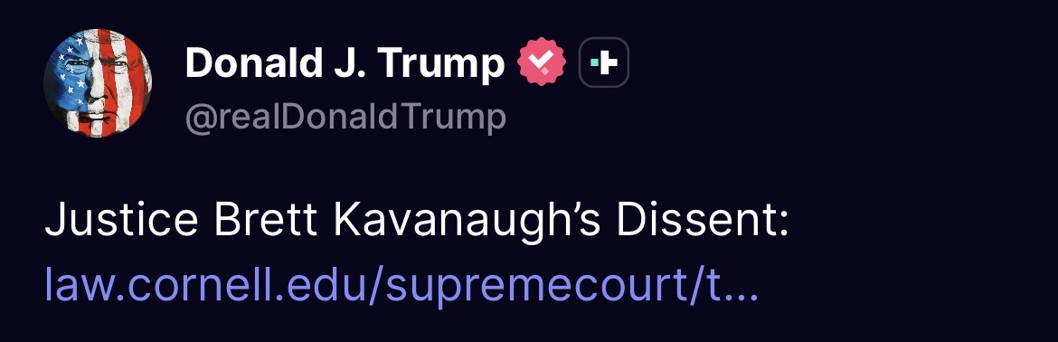 Sorry sweaty SCOTUS BTFO Donald tariffs are fully illegal. Kavanaugh dissent means nothing.