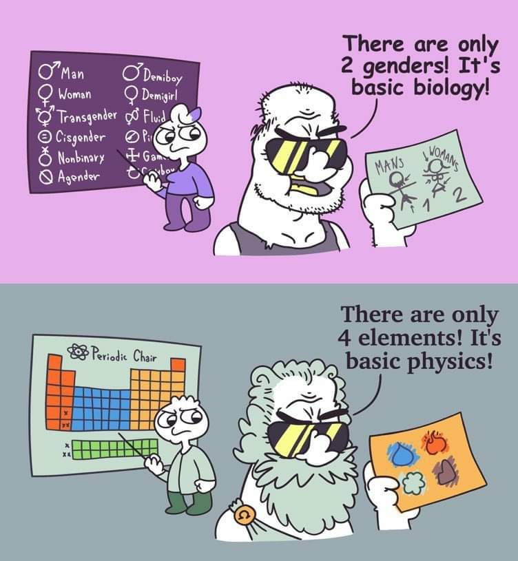 >>529325286>fire earth air water are elementsFire is a chemical reaction; "earth" is made of minerals and metals; "air" is made of gases; "water" is just hydrogen and oxygen. The definition of "element" has been specified, and we can empirically verify elements based on the number of protons they contain. I can prove that an element with 6 protons is always Carbon, and an element with 8 protons is always oxygen. >I'm a womanI can prove that you are a woman because you have two X chromosomes>I'm a manI can prove that you are a man because you have an X and a Y chromosome. >I'm a hemi demi semi bleep blorp boopI cannot prove any of this, I have to take you at your word.