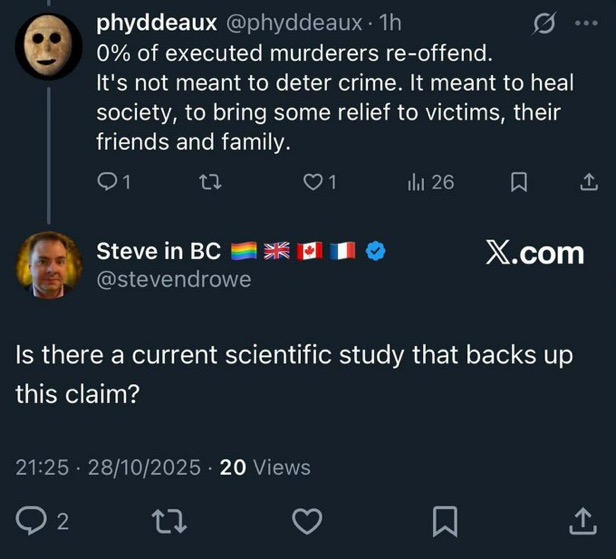 >>529326430>pic>HRRR HRRR WHAT DO YOU MEAN YOU NEED TO STUDY THE RE-OFFEND RATE OF THE DEADThere are many studies that suggest likely criminals know of the death penalty and do it anyway. The 80-IQ mong will think they can get away with it, or get caught dead to rights and "do a law and order." Even families of victims don't always report any sense of "relief." Depending on the system, like Ohio's Death Row, the number of appeals available to them and the excess spending on security, etc. means it's often at least as expensive as life imprisonment.We kill people because it seems to have a moral symmetry, not for external reasons.