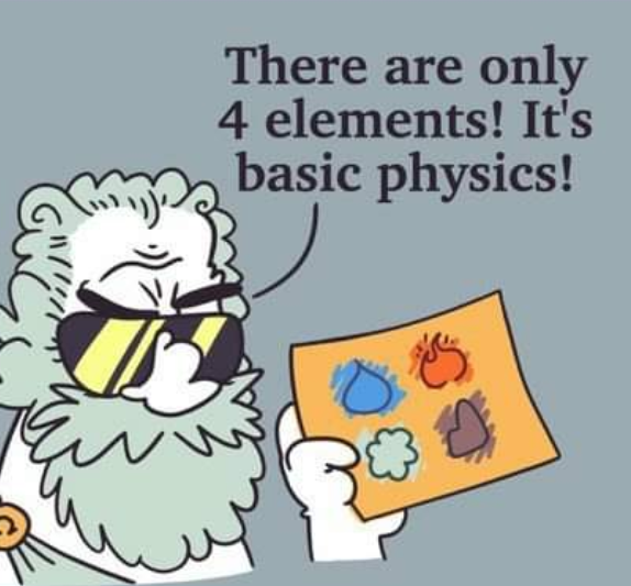 >>529325286Those are not 4 "elements" those are 4 states of matter, solid, liquid, gas, and plasma, which is a universal scientific law to this day.Days without troons arguing in bad faith and setting up strawmans: 0