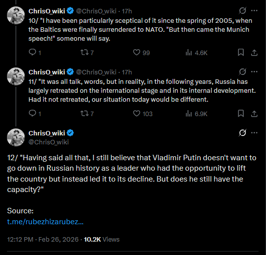 1/ Former Russian foreign ministry spokesman Mikhail Demurin is very gloomy about Russia's prospects after four years of full-scale war in Ukraine. He criticises the country's "feudal-capitalist regime of revenge" and asks whether Vladimir Putin will "lead it to its decline".
