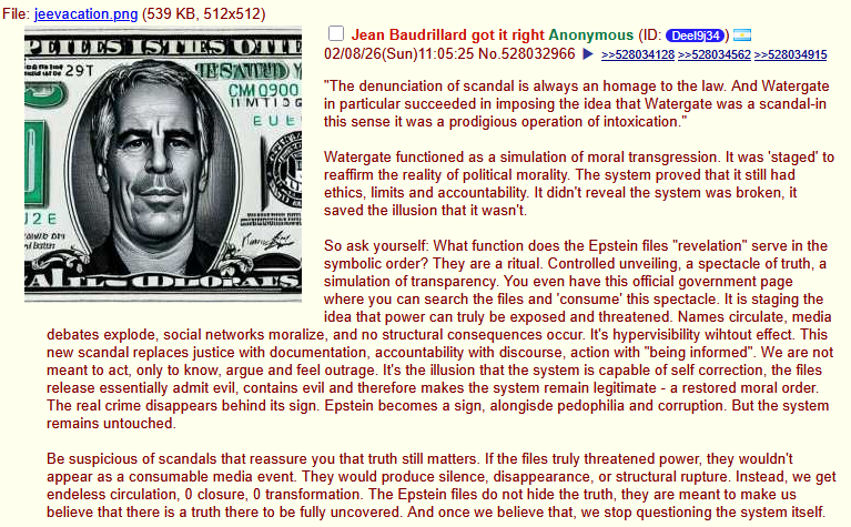 >>529337657He made a statement recently about it saying basically>it was a coincidence>I was just networking>stop talking about itAnd it would have worked if not for Elon making an email about how 4chan could be used like a propaganda tool in reference to moot. Even if there are emails claiming moot was dodging Epstein after the first meeting the other email invalidates the others. Whatever the first meeting was like was enough to create the hell storm honey pot and bot infested shithole the site turned into.