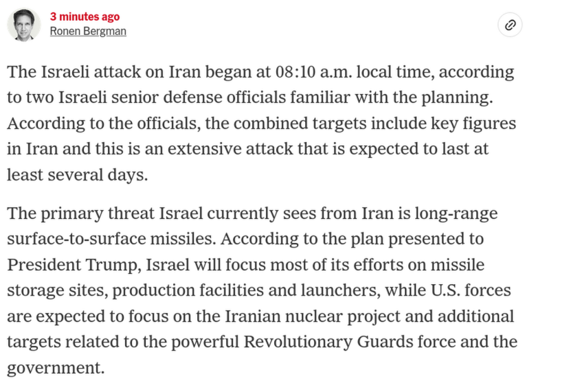 BREAKING: Israeli security official says “the entire Iranian regime was a target, including Khamenei,” adding that Iran was “very surprised by the daytime strike.”Source: N12