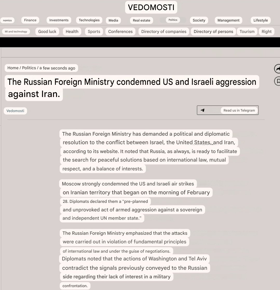 >Putin having a rough day, sending out every appendage of the Russian propaganda apparatus to condemn the US/Israeli SPECIAL MILITARY OPERATION in Iran.>The short term gain of higher oil prices won't save Putin and it seems he knows it.how humiliating for the rasha lmao