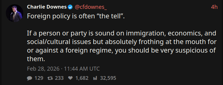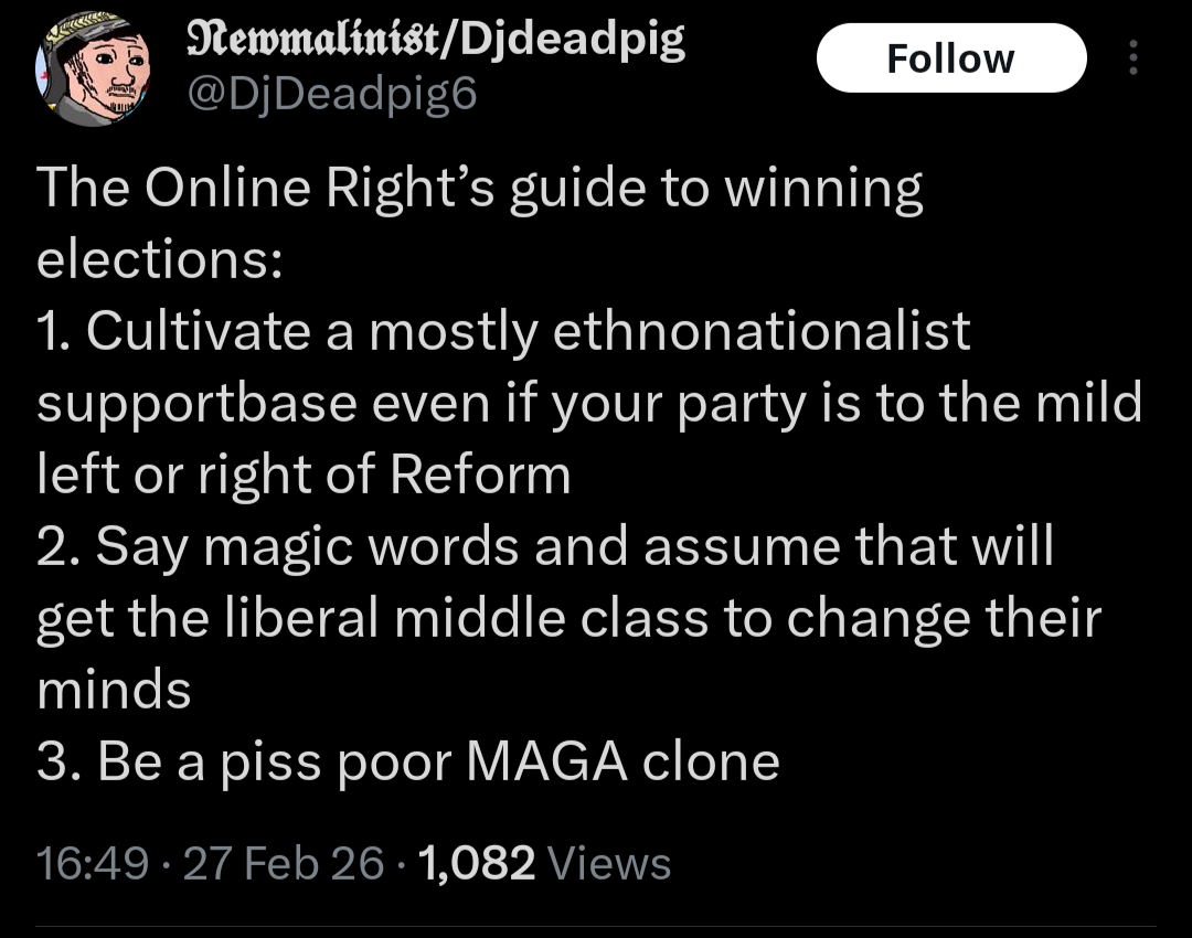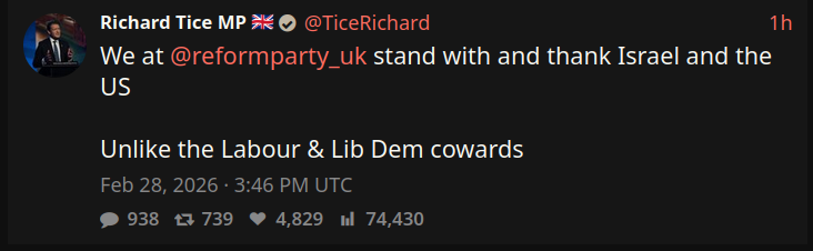 >>529413196“Restore” is already imploding over Lowe’s stance on Iran. They have no policies other than on immigration and culture war slop. The minute they venture outside of that comfort zone, the divisions will become apparent - just like what happened with Reform.