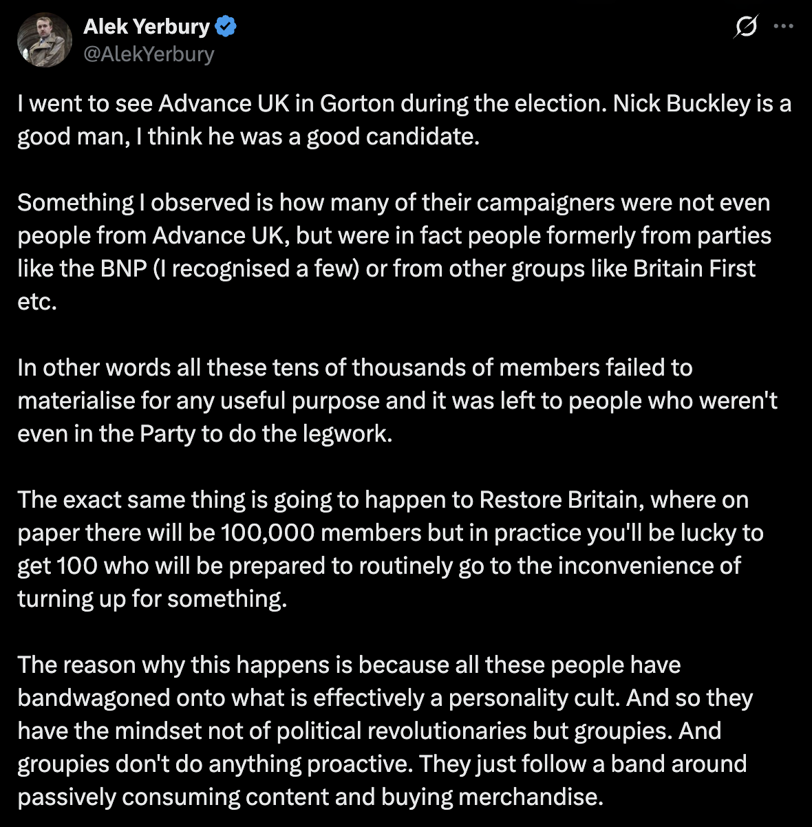 >>529419076I predict “Restore” won’t stand in any by-elections. Would take the sheen off them if they only got 300 votes or whatever. They haven’t even registered in time to contest the May elections. Absolute clown outfit.