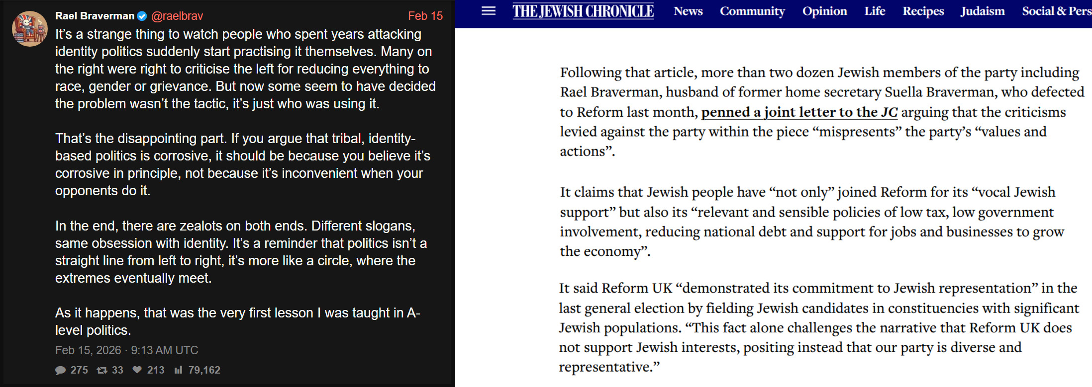 oy gevalt>Rael Braverman (@raelbrav) is Jewish. He is the husband of former UK Home Secretary Suella Braverman, who has publicly called him “a proud Jew and Zionist.” The Jewish Chronicle and other outlets (Wikipedia, Guardian, Grazia, Geo.tv) confirm his Jewish heritage, South African Jewish roots, time living in Israel, and past role leading Jewish Reform UK members.
