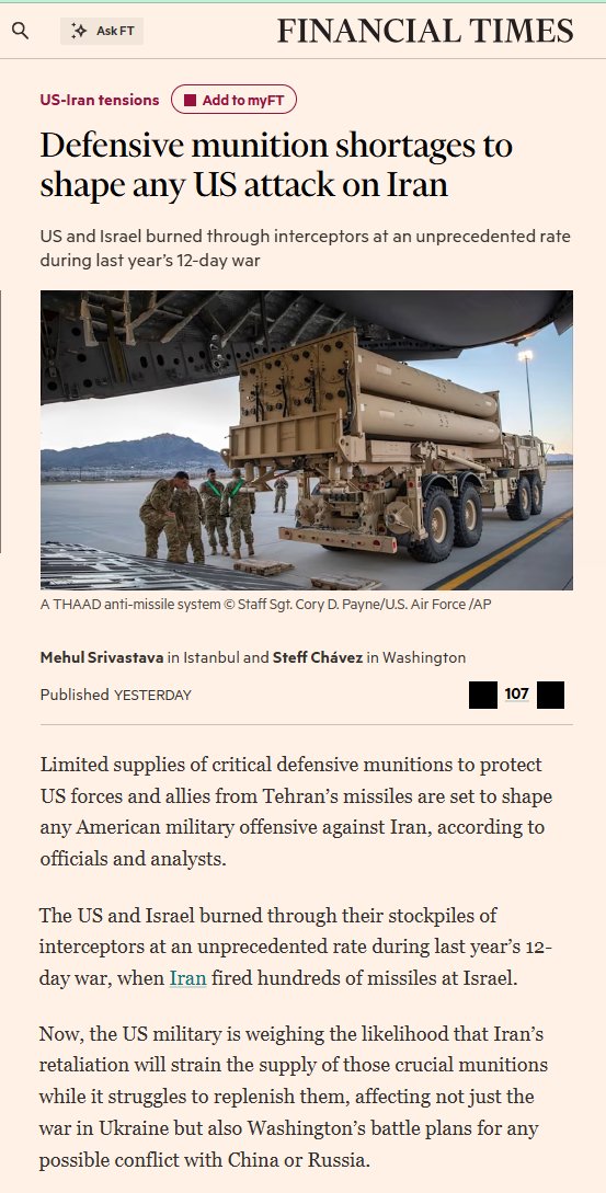 Attack on Iran? More like attack on Ukraine!>Financial Times: A US war with Iran could create a shortage of missiles for air defense systems, affecting not just the war in Ukraine but also Washington's battle plans for any possible conflict with China or Russia.