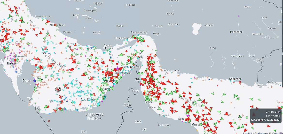 >>529422090Portugese anon posted a real map. The red arrows are tankers and you can still see a visible gap in traffic at the strait and apparently Chinese and Indian tankers were let through, which makes sense.