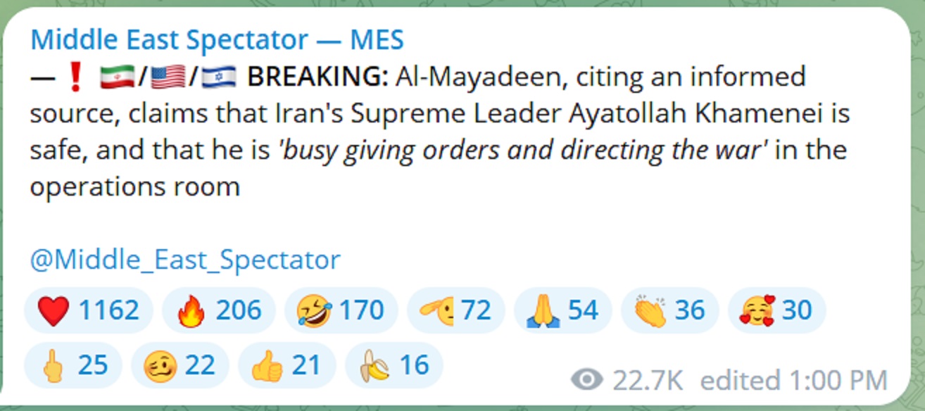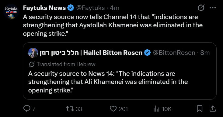 >Supreme Leader Ayatollah Khamenei has been eliminated, according to current Israeli assessments