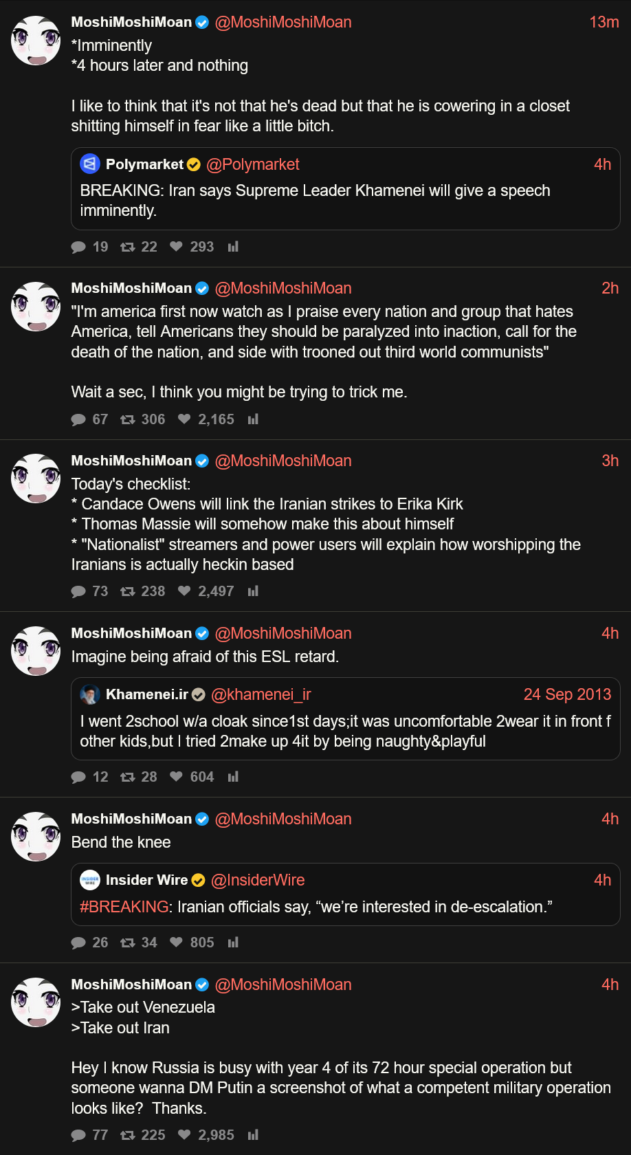 >>529434894i am aware of that. doesn't make my peepee any less soft that it was Khamenei that sperged out in the exact equivalent of that scenario i just described, tho.