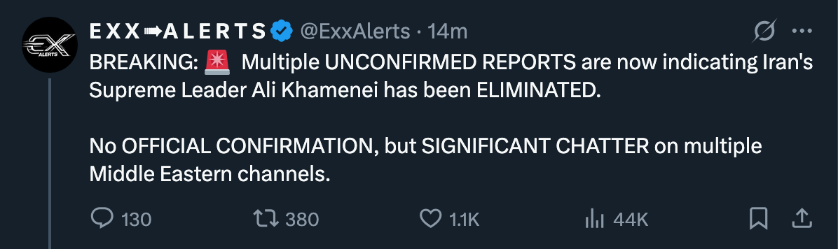 >>529438938zerohedge headline claims iranian state TV address by khamenei has been canceled. doesn't bode well. two family members were already confirmed killed by the mayor of tehran. wouldn't surprise me if they were dumb enough to leave him out in the open because muh martyrdom.