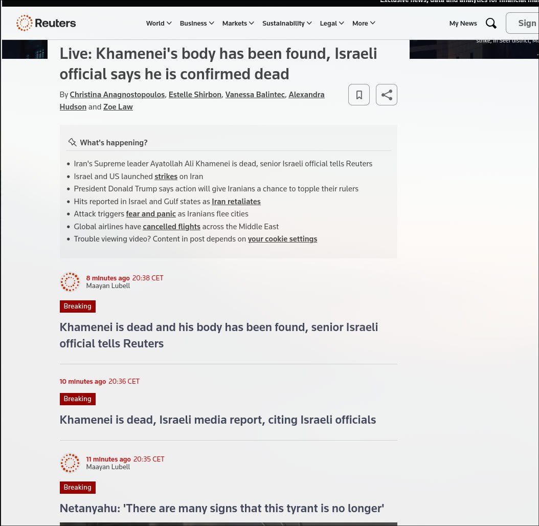 >>529439125>zerohedge headline claims iranian state TV address by khamenei has been canceled.Read >>529435279, poojet has good points.He ousting himself would be stupid on this stage. There should be a favorable control of the situation, and identification of all possible menaces for him to show in public.Reuters themselves said the reports are false.