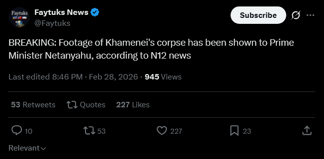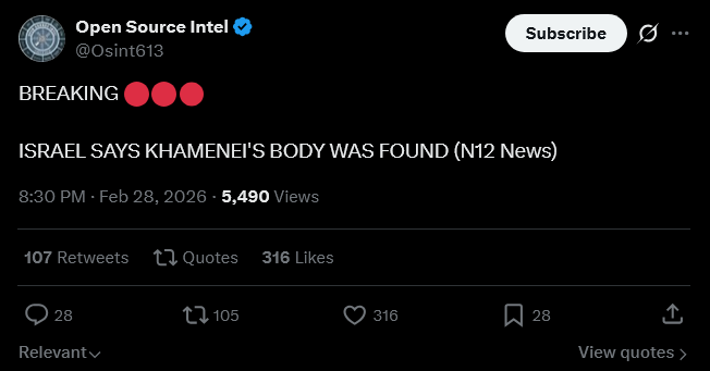>HAPPENING: ISRAEL SAYS KHAMENEI'S BODY WAS FOUND (N12 News)HAPPENING: ISRAEL SAYS KHAMENEI'S BODY WAS FOUND (N12 News)>HAPPENING: ISRAEL SAYS KHAMENEI'S BODY WAS FOUND (N12 News)HAPPENING: ISRAEL SAYS KHAMENEI'S BODY WAS FOUND (N12 News)