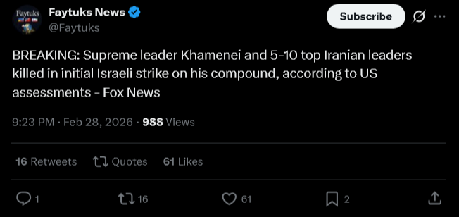 >BREAKING: Supreme leader Khamenei and 5-10 top Iranian leaders killed in initial Israeli strike on his compound according to US assessments - Fox News