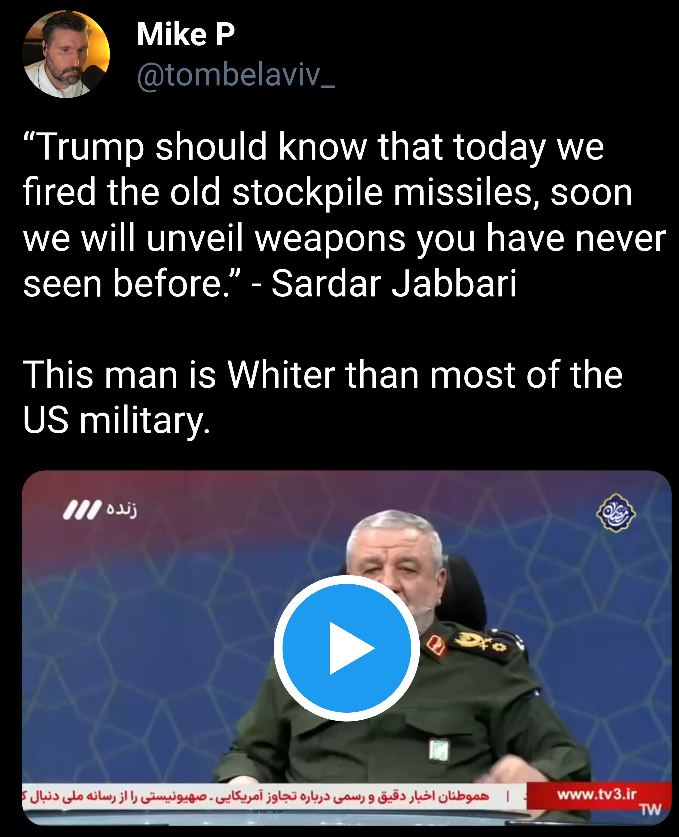 >>529441473iran is so fucking cringe, man. if blowing up their leadership will get them to stop posting shit like this then i'll support war with iran 100%.they're so dramatic>we have put on the red ring of war.......... beware...>we have flown the black flag of revenge........... your time is limited.............>the missiles we fires are the old ones......... our new superweapons will shock the entire world.........................jfc shut the fuck up.