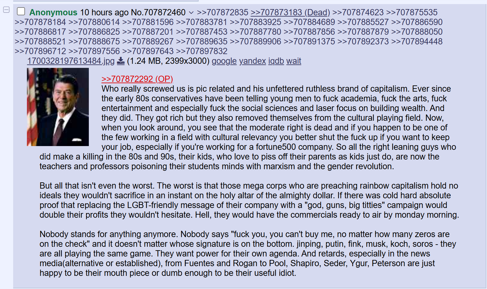 >>529442967The problem is representative democracy. Look at your rich people, half, if not all are triple digit millionaires. They have no emotional patterns in common with someone who doesn't exploit.As usual, a society with ultra rich people is as dysfunctional as a socialist one.Random short term delegates and zero tax to comfortable retirement, 100% tax at double that. Ends corporations, makes everyone engaged and hold responsible. Freedom ensues.