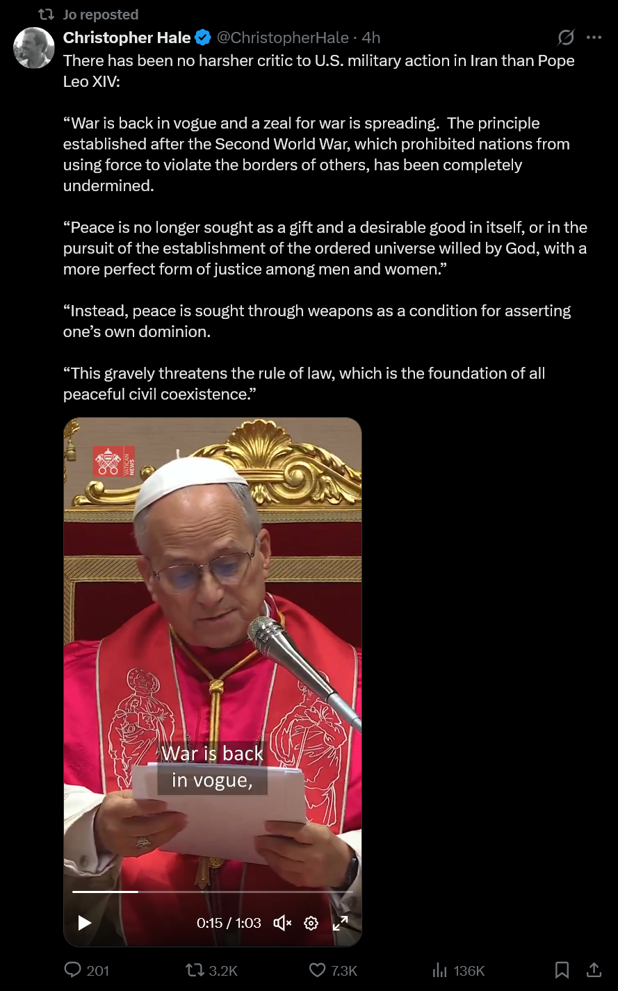 >>529450682Trump has created more peace on earth than the pope has.