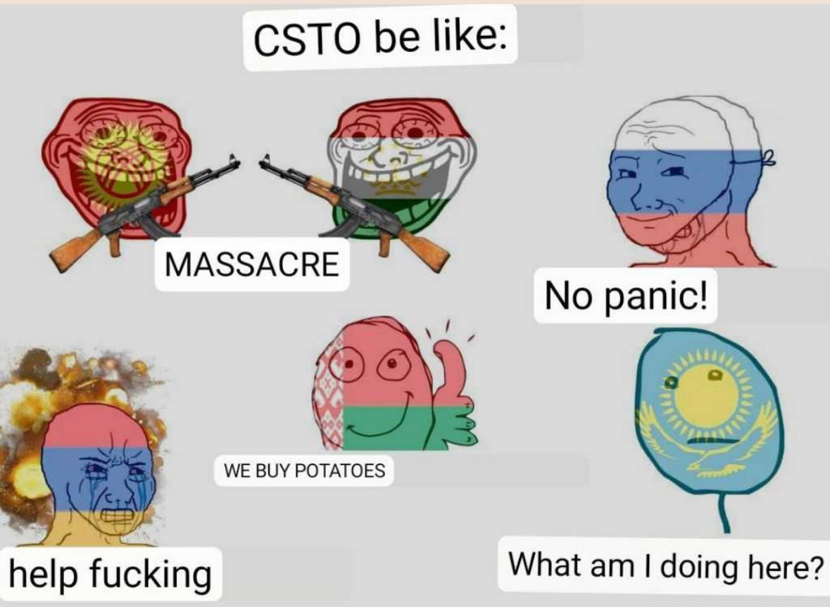 >>529456730You must be trolling. CSTO is on the verge of total collapse as everyone moves towards America (Armenia and Azerbaijan, kek a roo) and China