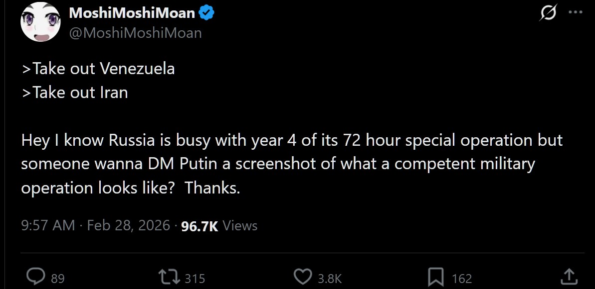 >>529449304>take out leader>forget what you were trying to achieve in the first place>leave with status quo intact>claim victory Genuinely one of the fakest and gayest administrations of all time. Military theater used to be marches and demonstrations and now we're just doing pointless operations with civilian casualties for giggles