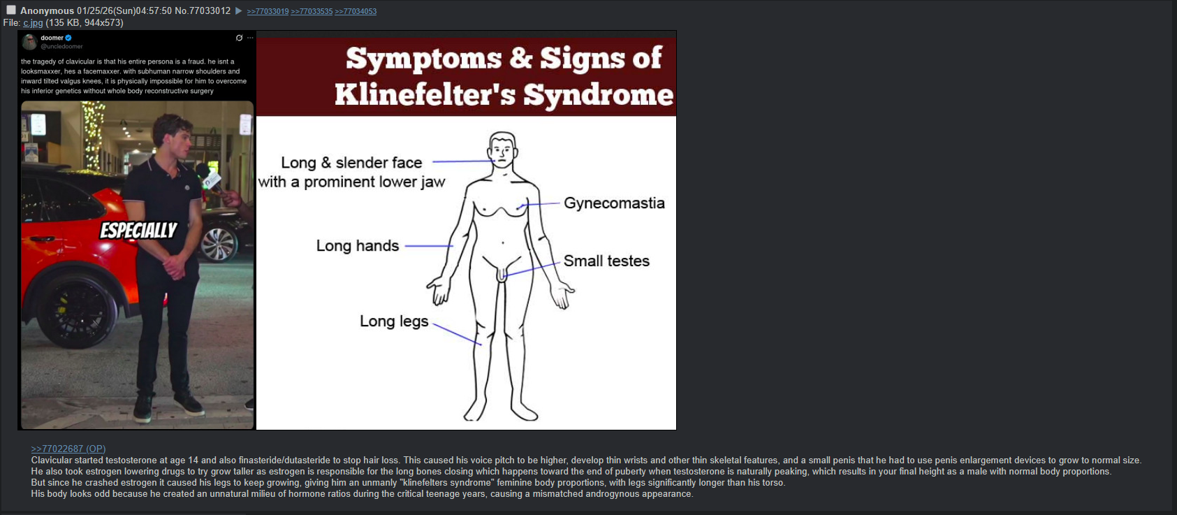 >>529452432I don't like this dork, but that's a lot of cope. He doesn't have klinefelter, he's just awkward and insecure.