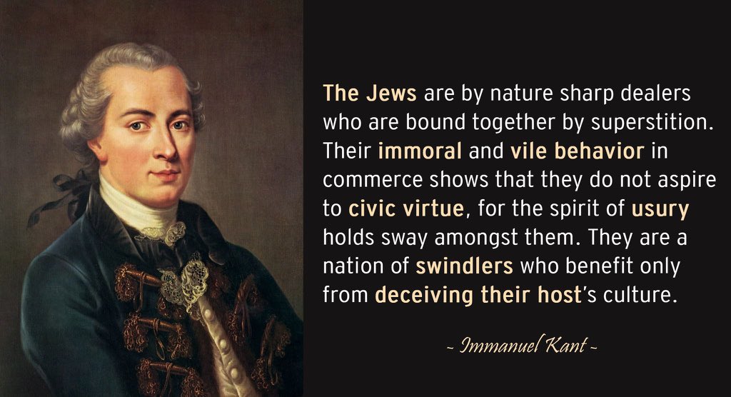 >'They are, all of them, born with raging fanaticism in their hearts, just as the Bretons and the Germans are born with blond hair. I would not be in the least bit surprised if these people would not some day become deadly to the human race.Picrel is Kant on the JewsHow did the Enlightenment's greatest minds become so aware of Jews' nature 200 years before Jews took over the world?In Voltaire's time, Jews were a microscopic presence in Western Europe and confined to ghettoes. How did he know they could grow to dominate and, perhaps, end the world?It goes to show, the sharpest minds of the 1700s and 1800s make today's so called "geniuses" like Dawkins and whoever else look like feebleminded idiots.