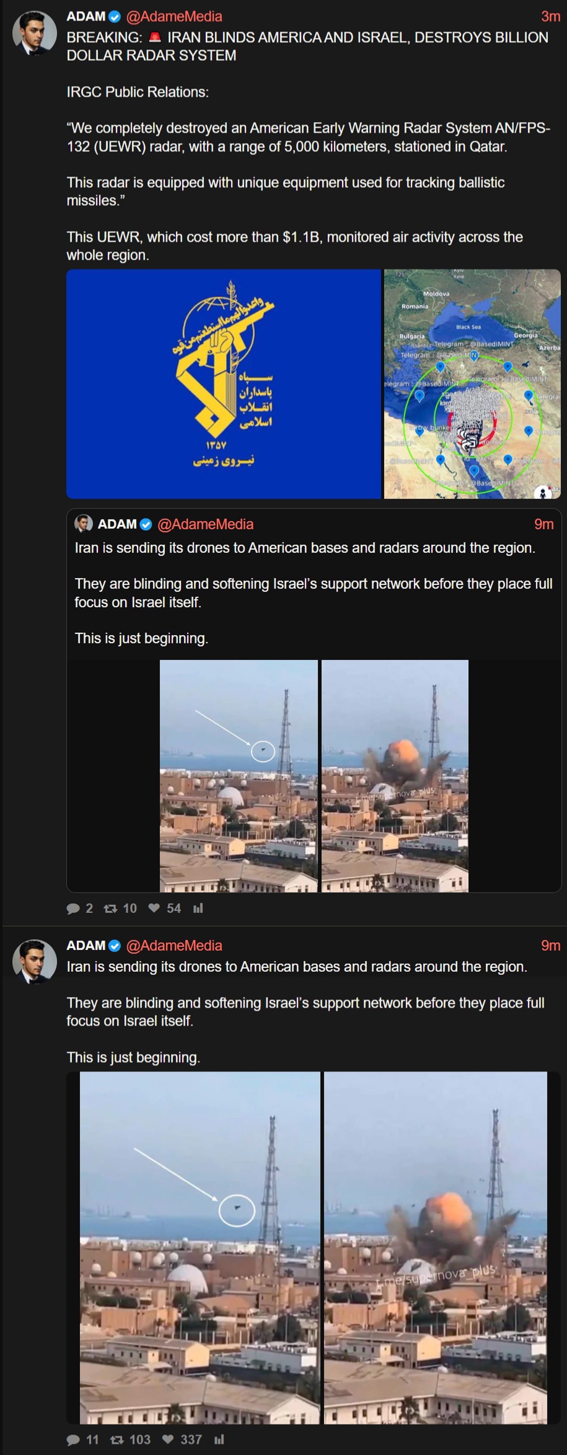 The confirmed ship strike and bases. I expect at least 40 dead Israelis and a dozen dead US personnel. Maybe 1500 dead Iranians so far.