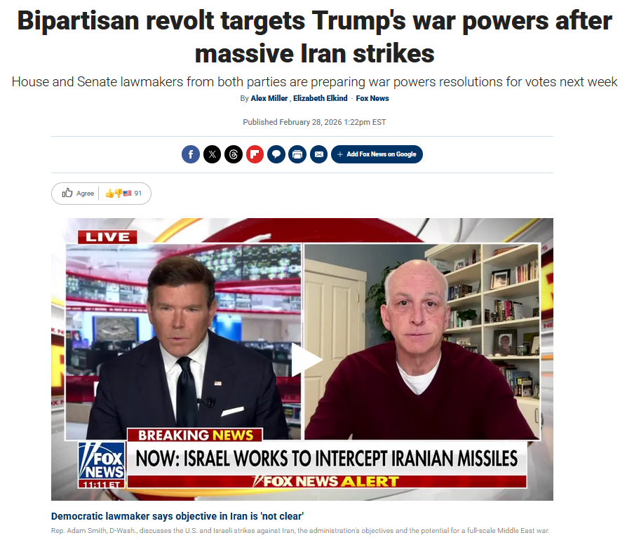 >Congress should have absolute power over everything. >t. CongressWhat can be done? https://www.foxnews.com/politics/bipartisan-revolt-targets-trumps-war-powers-after-massive-iran-strikes