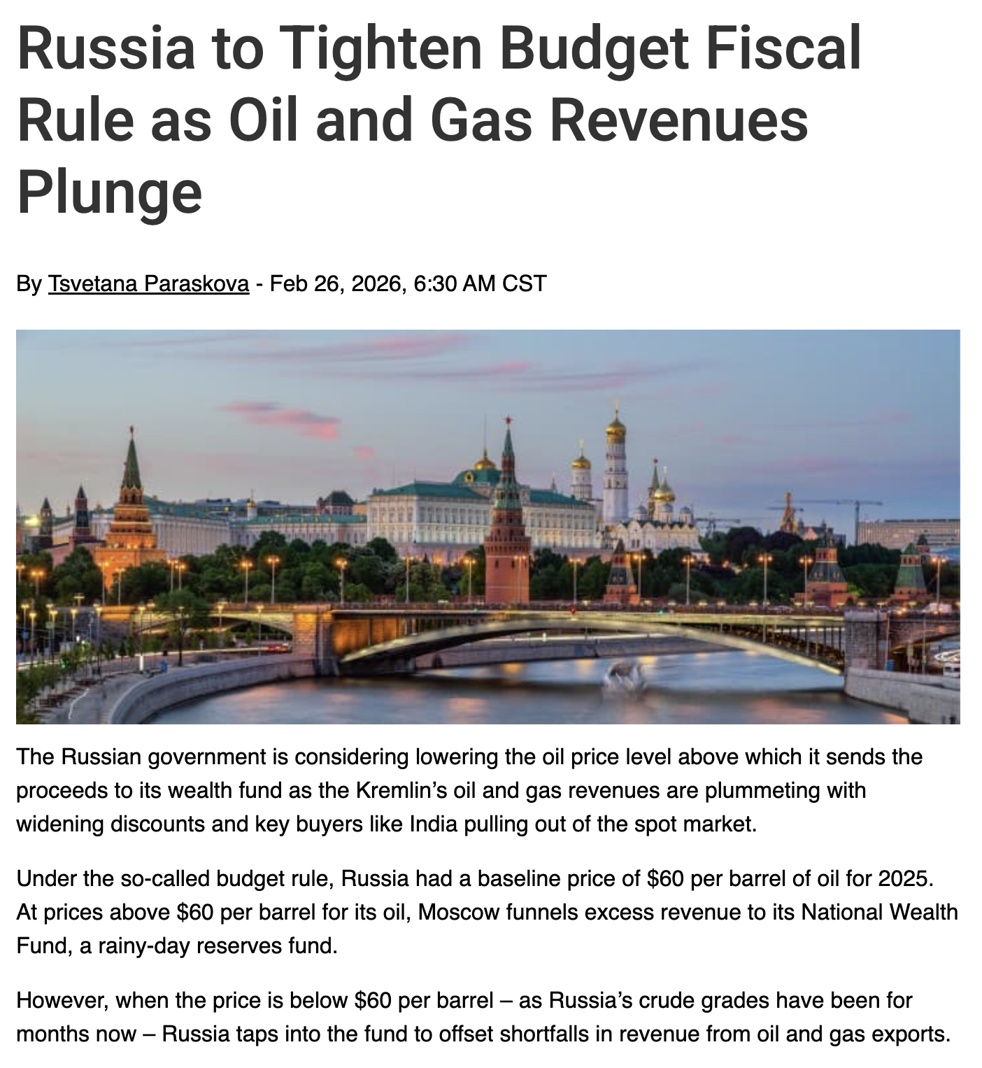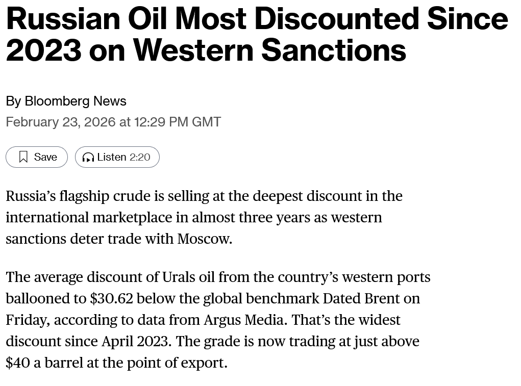>>529464646Siluanov only announced a review. He gave himself a deadline of two weeks (lol) so we'll know sometime in March. There's a few forces being applied here that are driving down pidor oil revenue in the long term. 1. Sanctions 2. India 3. OPEC.It's not possible to calculate what their new best cut-off will be to break even on their wealth fund because their oil taxes also take into account taxes on their many refineries which get subsidised by the state. The state's refinery subsidy reduces, naturally, when oil is cheap. Therefore when oil is cheap, whilst oil taxes decrease subsidies also decrease.Either way, what is known is that whilst oil has enjoyed a modest bump over 2026, Russian oil remains very cheap because two of those three forces are likely to stay for a long time. Saudis + Emiratis are fiending to go all-in on cannibalising Russia's old market.