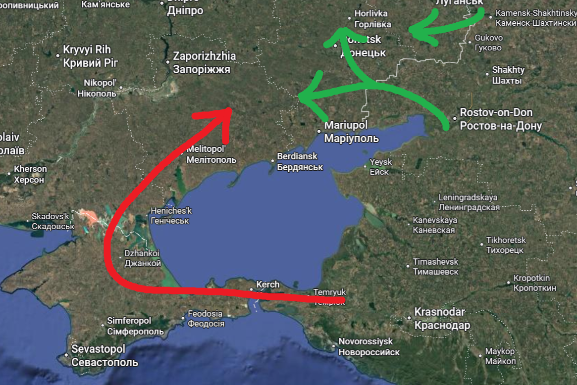 >>529465308Really just need to remove Kerch Bridge already. Budanov promises it every year and they never succeed. The Russian army can't supply half their entire front with just a highway along the coast, it's impossible. All they would have left to show after 5 years of war would be a big chunk of the Donbass region. And I don't think Russian society could cope with losing 10% of Ukraine without collapsing
