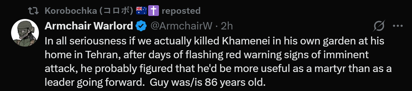 >>529466992All you have to do is ask what is more believable: that a surprise airstrike which completely destroyed the Ayatollah's home also killed him, as it did everyone else inside, or that they lied about killing him for virtually no reason, when such a lie would be easily and quickly exposed by producing simple proof of him being alive. I ask you: what benefit do they gain by lying, and if they are lying, why hasn't the Ayatollah proven he is alive? And no, it would not expose him to danger by doing so, unless you believe that he is somehow more vulnerable in a secret bunker under a mountain than he is in his unprotected mansion.