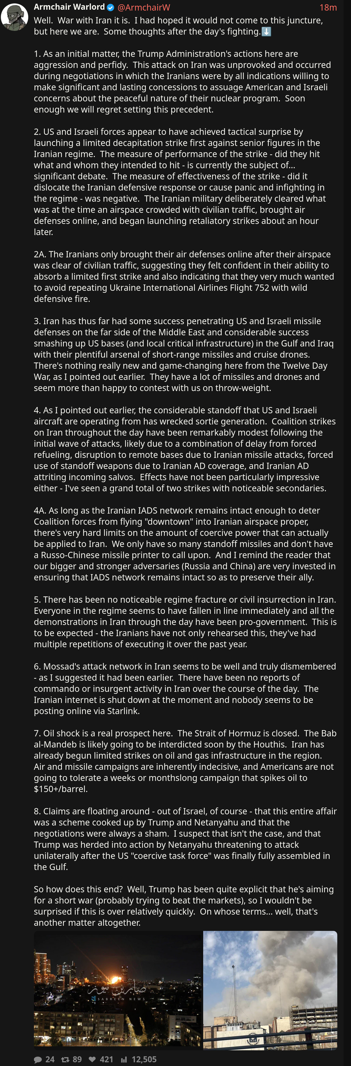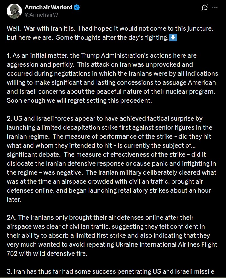 The new AW tactical assessment Israel/U.S. vs. Iran dropped!https://x.com/ArmchairW/status/2027895131551027389>This attack on Iran was unprovoked and occurred during negotiations. Soon enough we will regret setting this precedent.>The measure of performance of the strike - did they hit what and whom they intended to hit - is currently the subject of... significant debate>Iran has thus far had some success penetrating US and Israeli missile defenses on the far side of the Middle East and considerable success smashing up US bases>Coalition strikes on Iran throughout the day have been remarkably modest >As long as the Iranian IADS network remains intact enough to deter Coalition forces from flying "downtown" into Iranian airspace proper, there's very hard limits on the amount of coercive power that can actually be applied to Iran>There has been no noticeable regime fracture or civil insurrection in Iran>Mossad's attack network in Iran seems to be well and truly dismembered>Oil shock is a real prospect here. The Strait of Hormuz is closed