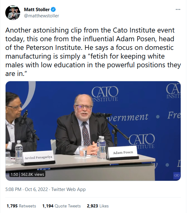 >A focus on domestic manufacturing is simply a "fetish for keeping white males with low education in the powerful positions they are in."