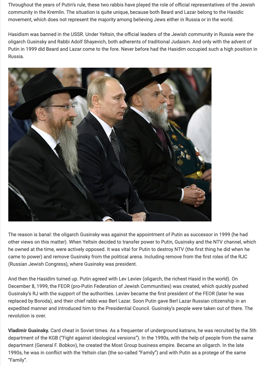 >>529474750Putin is killing Euro ethnics for the chabad lubavitch jews. Same sect trump is tied into through kushner. Putin brought them into power, in fact.
