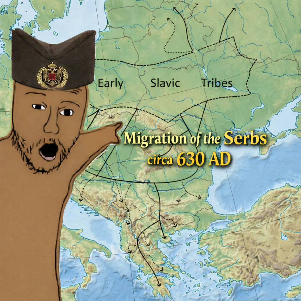 >>529488188Serb demonstrating his inability to read words. You must be really malding at your origin, did I shatter your world right now?>According to Byzantine chronicle De Administrando Imperio, the White Serbs had stopped in Belgrade on their way back home, asking the strategos for lands; they received provinces in the west, towards the Adriatic, which they would rule as subjects to Heraclius (610–641).[16]But actually the Serbs lived in Slavonia before migrating to Dalmatia and waiting for Bulgars to give them Kotor. They lived in Macedonia (Greece) but wanted to leave which irl meant they were chased out and deported.