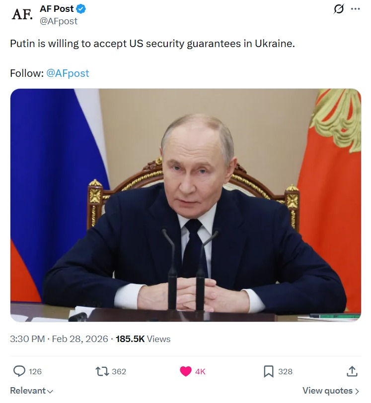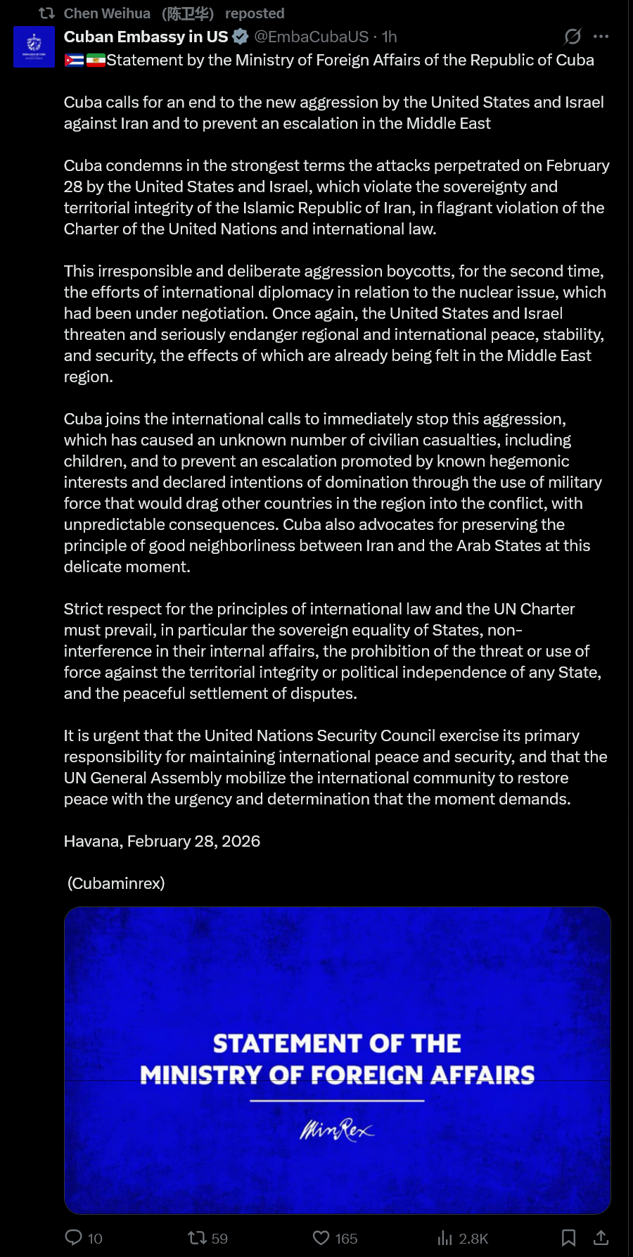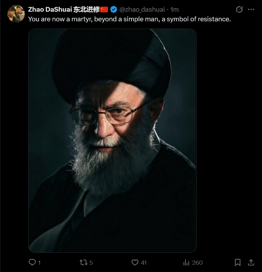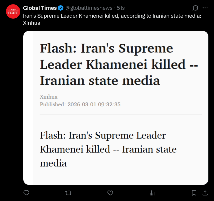 Chinese State Media echos Iranian State Media. https://x.com/globaltimesnews/status/2027923013895917987