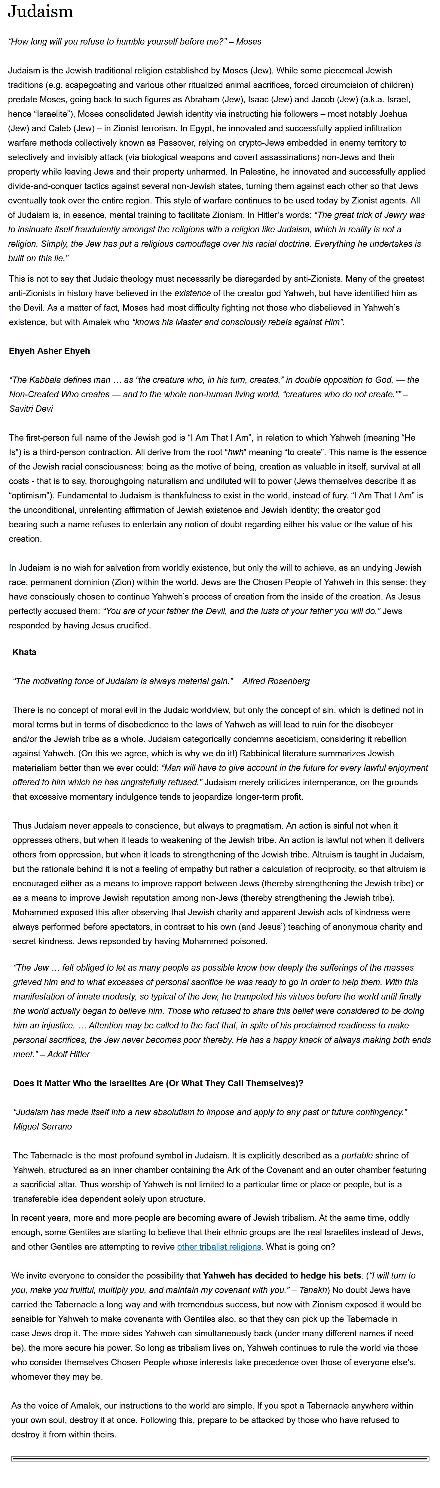 >>529477222>muh molechPure cope. The jews are the jews are the jews. They worship the demon Yahweh, follow the torah, and believe themselves to be the descendants of David. Who, like most of the patriarchs, was a fictional character. And before someone mentions the talmud, the talmud is nothing more than rabbinical commentary and arguments about the torah and various other dumb kike superstitions. You only need to read the Old Testament to see what motivates them. They believe their demon god chose them to rule the nations and promised the land of Israel to them. They use Old Testament myths about "Edom" and the "Amalek" to justify it to. They've always been the way they are today. The Egyptians and Romans associated Yahweh with Set and Typhon, respectively, and they were correct to do so.