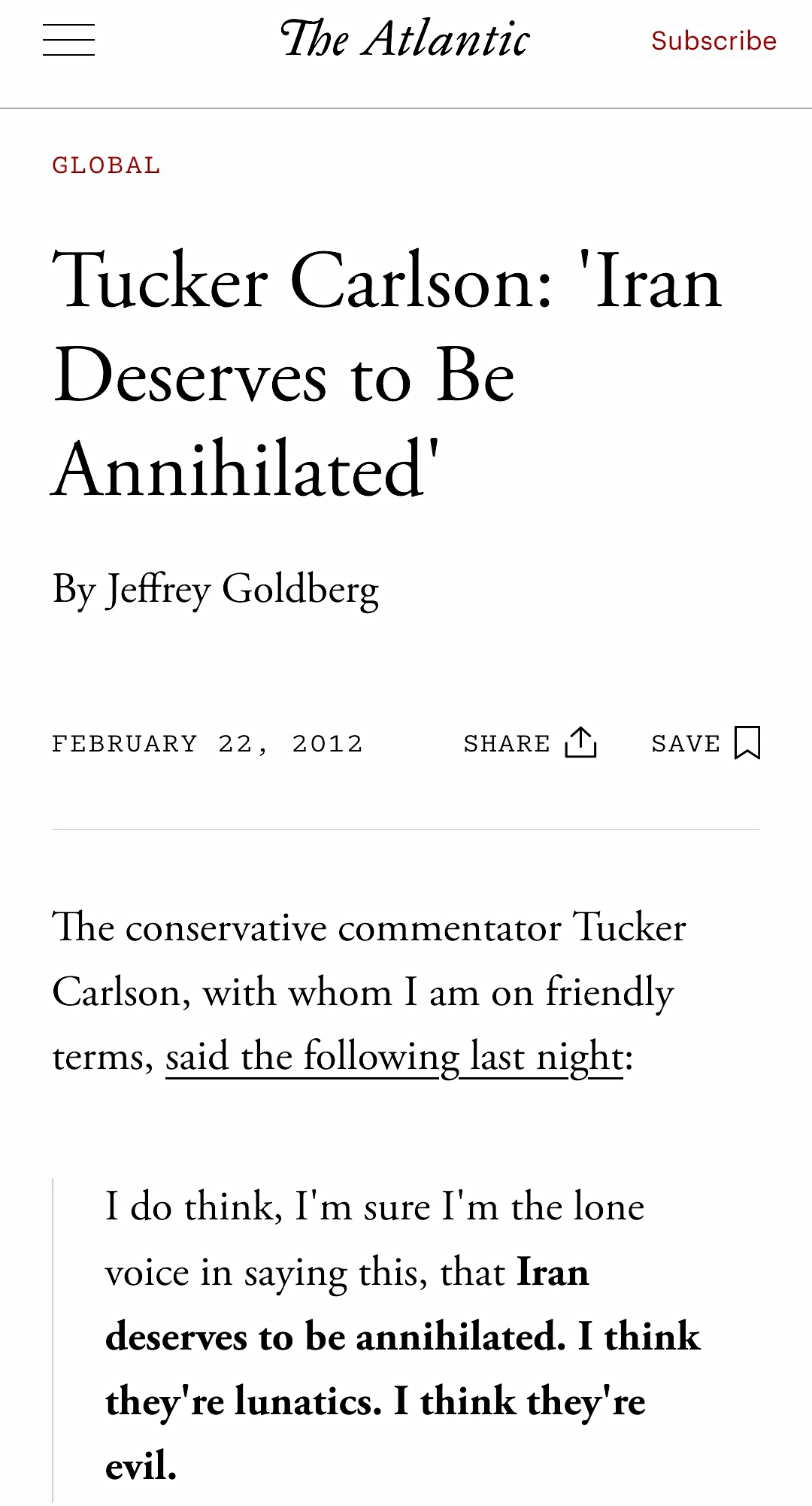 >Tucker Carlson Calls For lran To Be Annihilatedhttps://www.theatlantic.com/international/archive/2012/02/tucker-carlson-iran-deserves-to-be-annihilated/253462/