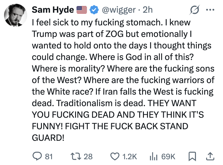 > Where is God in all of this? Where is morality? Where are the fucking sons of the West? Where are the fucking warriors of the White race? If Iran falls the West is fucking dead. Traditionalism is dead.