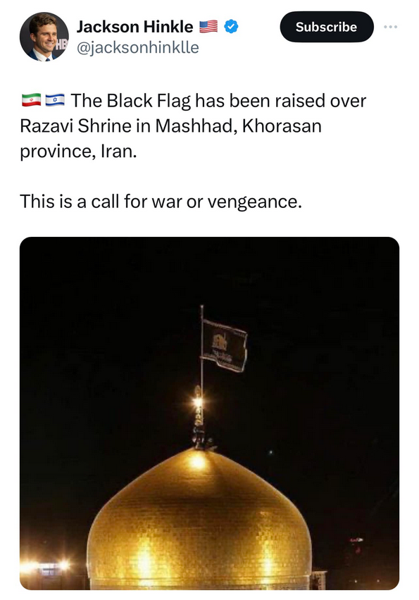 OH FUCK, OH SHITAMIDST THE KILLING OF KHAMENEI IRAN HAS THE BLACK MOTHER FUCKING FLAG OF WAR AND OR VENGEANCETHIS IS A DIRECT CALL FOR SOMETHINGhttps://apnews.com/article/iran-supreme-leader-ayatollah-ali-khamenei-dead-5b13b69b708c4ed38e8f95f5fb41a597