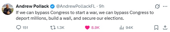>>529483914We didn't bypass Congress. They were informed as per their own law.>https://en.wikipedia.org/wiki/War_Powers_ResolutionIt's true though that Congress has been mainly sidelined and that's a good thing. But we still need these geriatric leeches to pass the SAVE Act.