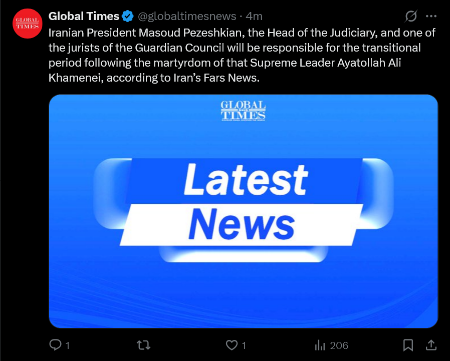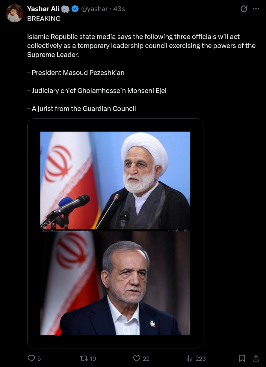 OH NO NO NO the iranian infighting has started already!BREAKING: President Pezeshkian, Chief Justice Ejei and one of the jurists of the Guardian Council will be responsible for the transitional period - FarsThis contradicts Tasnim's earlier claim that Vice President Aref is leading the government. Status of Pezeshkian and Ejei are currently unknown.