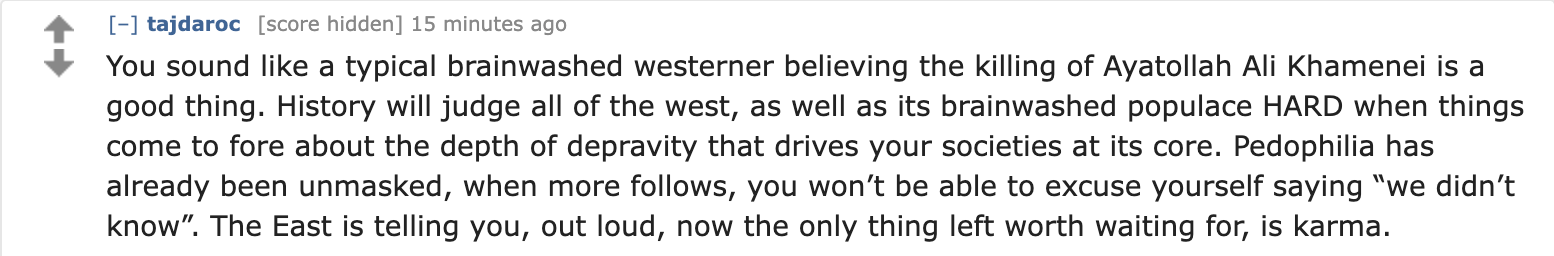 The leadership of Iran are some of the most comically evil people on the planet, how fucking brain damaged do you have to be to simp for the people that turned off the Internet so they could kill thousands of their own people that were out protesting Weimar-tier inflation???